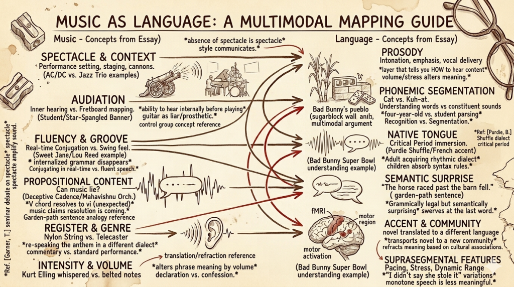 What if music doesn’t just function like a language but is, in every structurally meaningful sense, a language? One with its own phonemes (pitch), its own syntax (rhythm), its own grammar (harmony), its own accents and dialects (timbre), its own prosody (dynamics), its own pragmatics (performance context, visual presentation, the whole apparatus Tom wanted to strip away and his classmate wanted to celebrate)? What if the reason I understood Bad Bunny without understanding Spanish is that Bad Bunny was speaking two languages simultaneously—Spanish, which I don’t speak, and music, which I do—and the musical language was so fluent, so precise, so expressively specific that it carried the full communicative payload on its own?